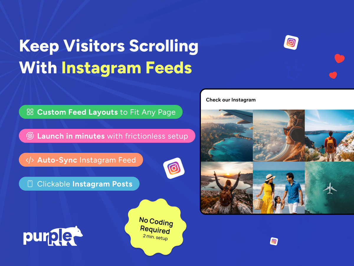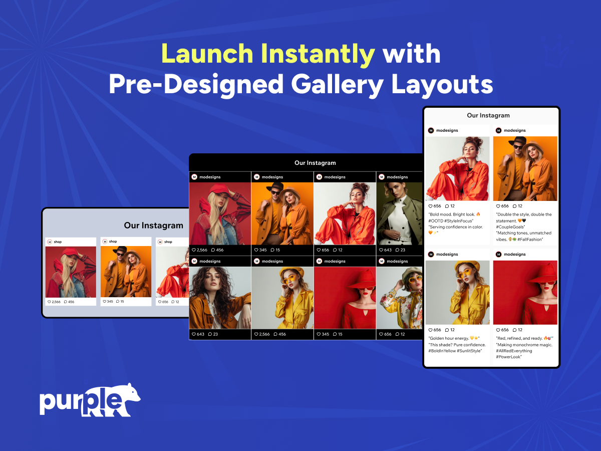 Crie belas seções de galeria do Instagram sem a necessidade de codificação e exiba postagens em layouts de grade, slider ou alvenaria que combinem com o design do seu site.