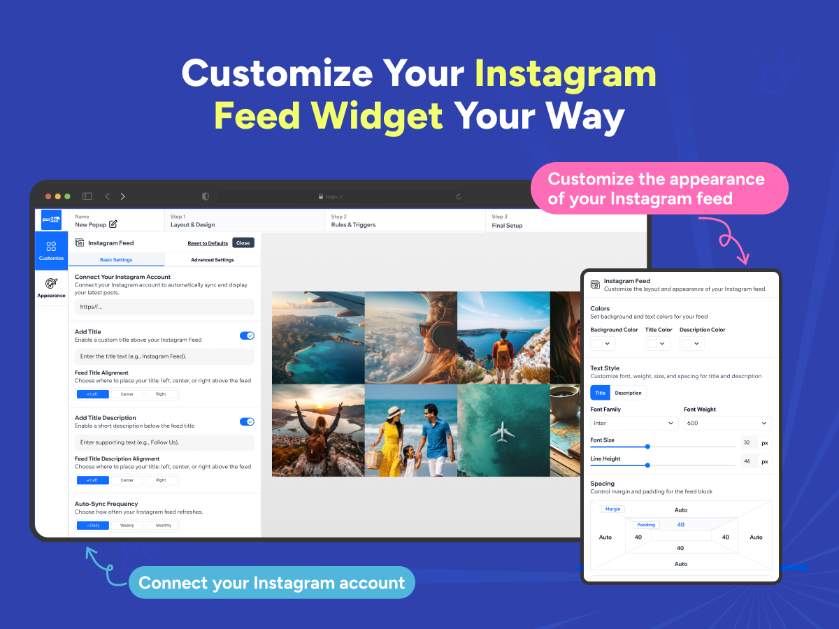 Widget personalizável do Instagram: ajuste as cores, espaçamento e layout para combinar com a marca e o design do seu site.