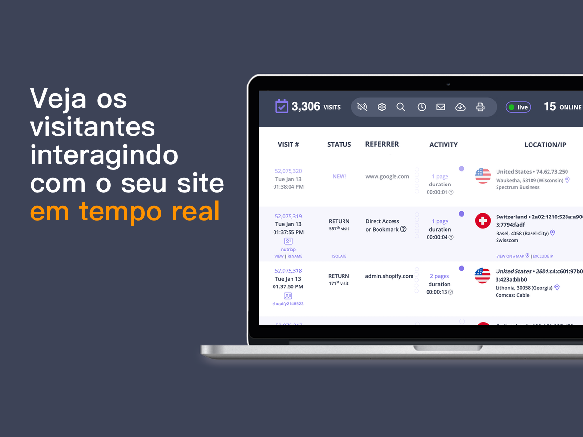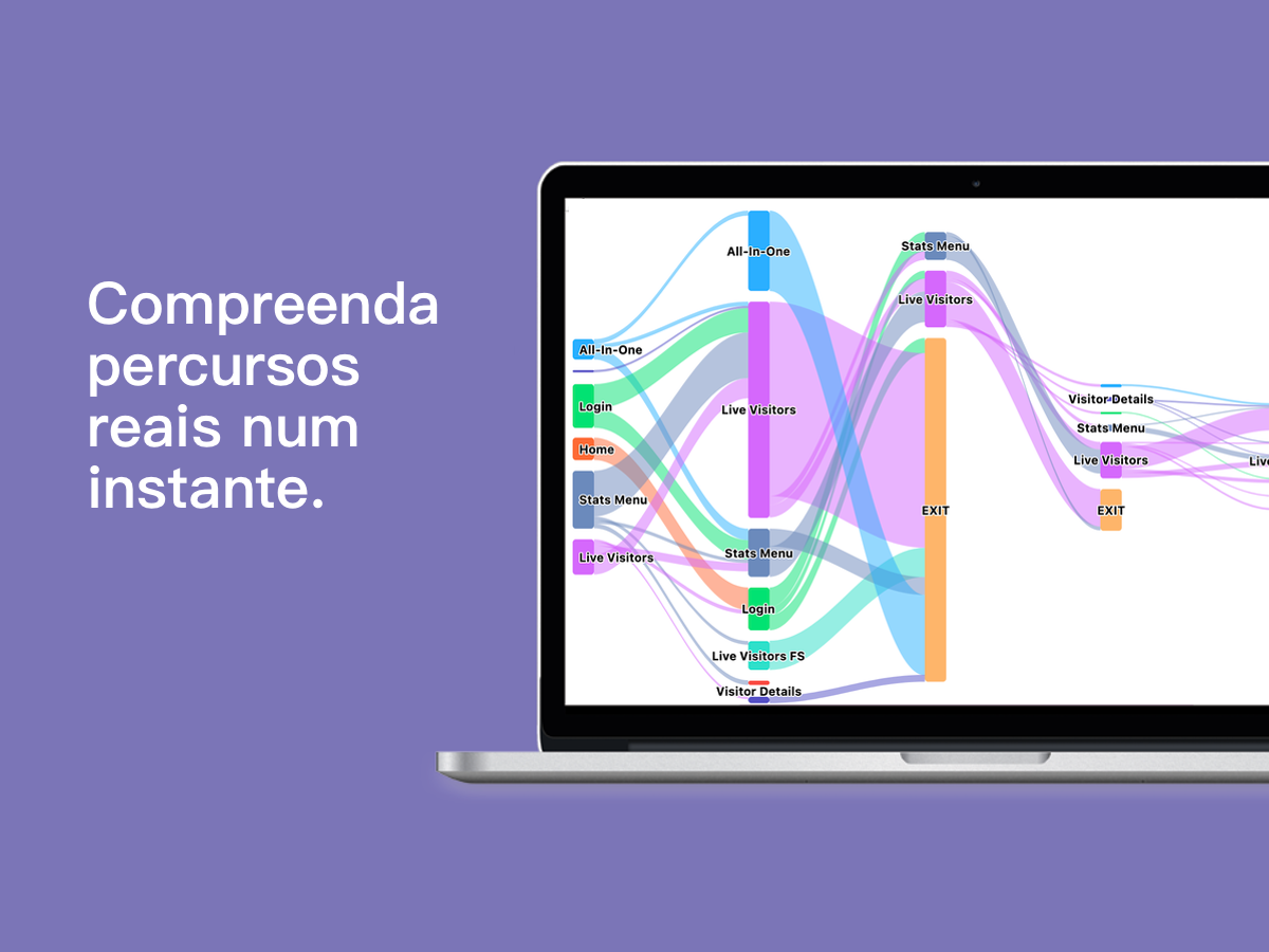 Monitorização em direto das interações: acompanhe os visitantes durante toda a sua visita em tempo real. Veja como navegam pelas páginas, onde passam mais tempo e como interagem com o seu conteúdo — à medida que acontece.